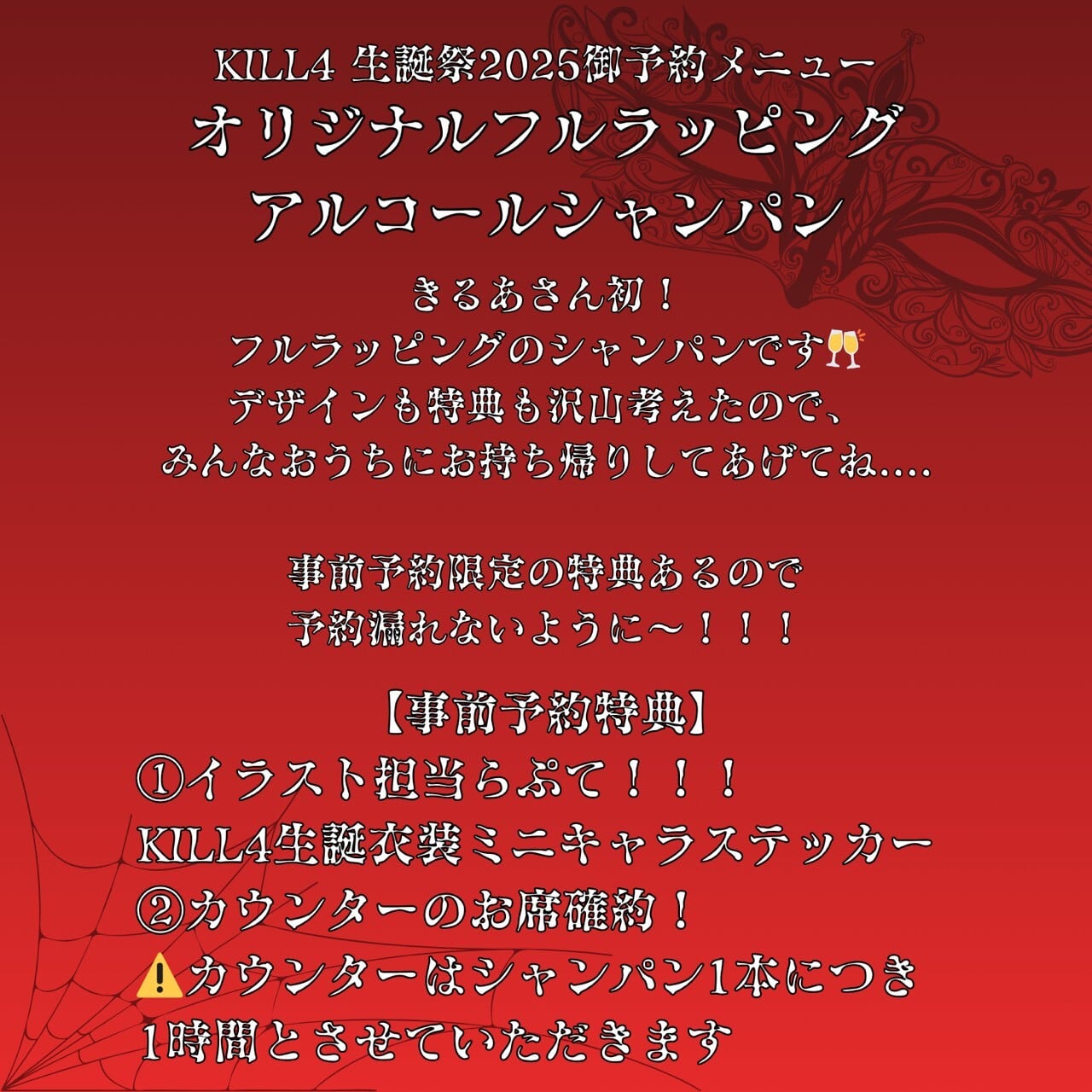 2025年11月1日に開催される『KILL4生誕祭2025』にて販売のオリジナルフルラッピングアルコールシャンパンご予約ページです。