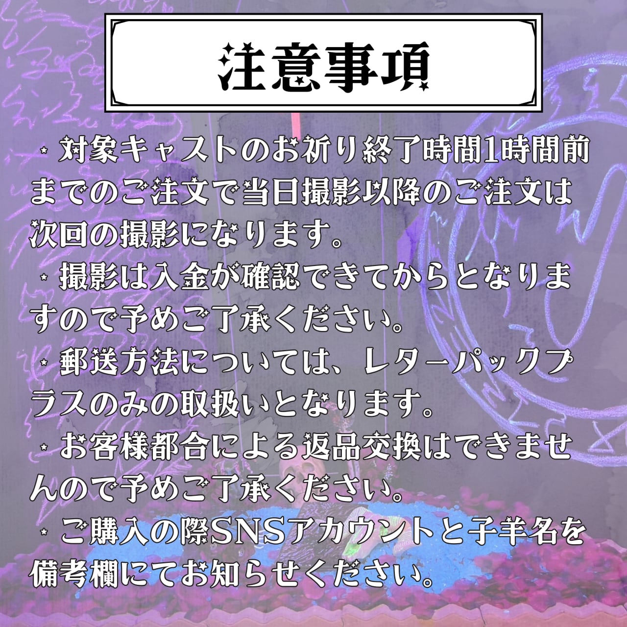 ・キャストのお祈り終了1時間前までに購入&入金が確認できたもののみ当日撮影の対象となり以降ものは次回のお祈りの際撮影となります。